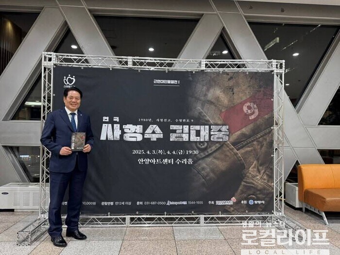 | ▲ 최대호 안양시장이 지난 4월, 연극 ‘사형수 김대중’을 관람한 후 기념촬영을 하고 있다. (사진출처=최대호 페이스북) |
