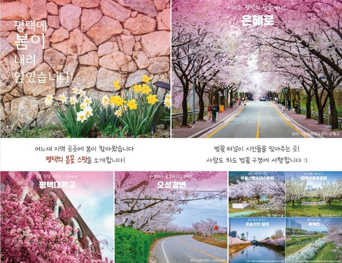 또한 “특별히 은혜로, 평택대, 오성강변을 추천한다”며 “이제는 널리 알려져 타 지역에서도 찾아오는 평택의 봄 명소이다”라며 “또, 무봉산청소년수련원, 함박산중앙공원, 포승산단 일대, 통복천 일대에서도 아름다운 봄을 느낄 수 있다. 이번 봄과 함께 좋은 일들이 시민 여러분을 찾아가길 기원한다”고 덧붙였다.