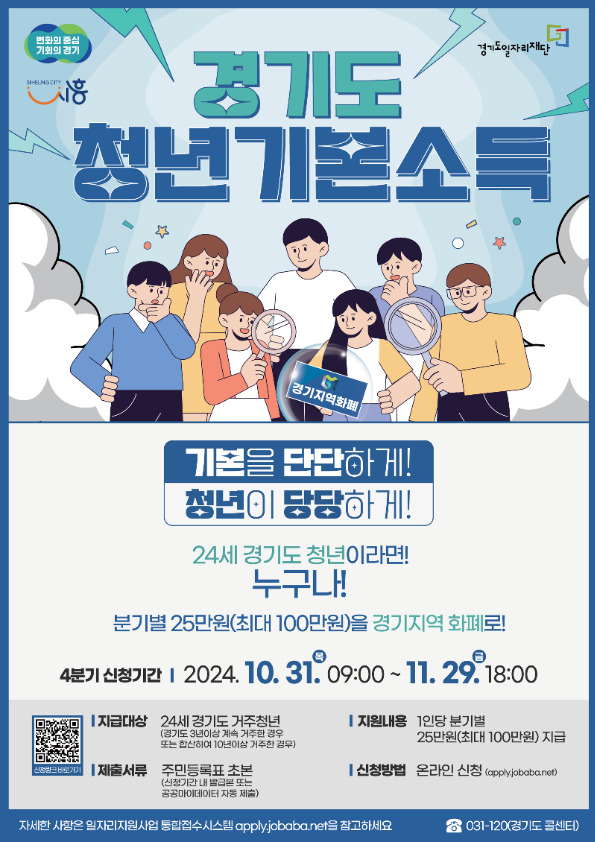 시흥시(시장 임병택)는 10월 31일부터 11월 29일까지 ‘2024년 4분기 청년기본소득’ 지급 신청을 받는다.