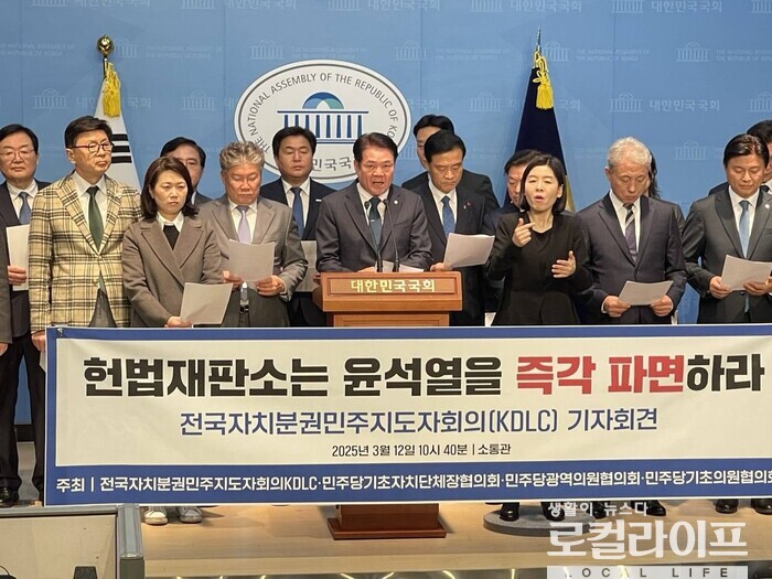 [안양=로컬라이프] 송준형 기자 = ‘더불어민주당 전국자치분권민주지도자회의 KDLC’와 ‘더불어민주당 기초자치단체장협의회’, ‘더불어민주당광역의원협의회’, ‘더불어민주당기초의원협의회’는 공동으로 ‘윤석열 즉각 파면 촉구’ 기자회견을 12일, 국회 소통관에서 가졌다.