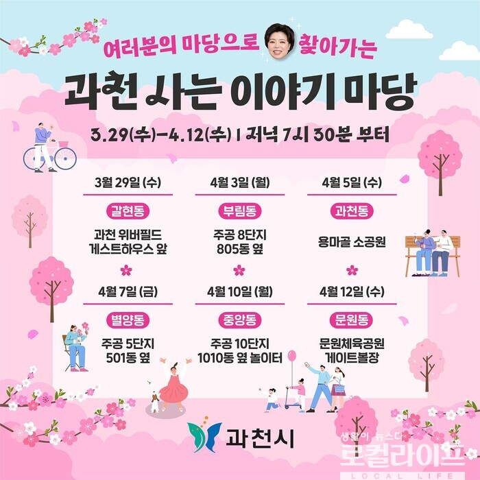 [과천=로컬라이프] 송준형 기자 = 신계용 과천시장이 3월 29일부터 4월 12일까지 6개 동을 돌며 ‘과천 사는 이야기 마당’을 진행한다.