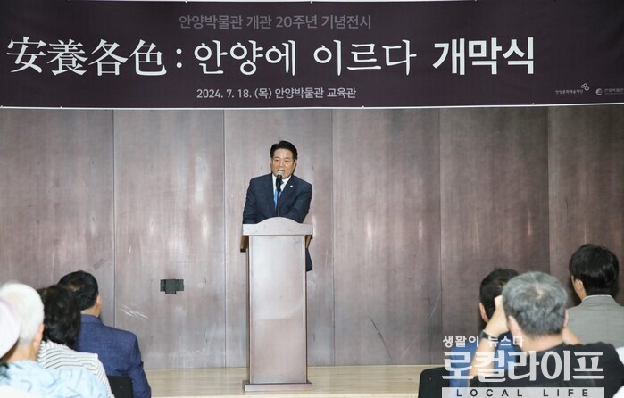 | ▲ 최대호 안양시장이 안양박물관 개관 20주년 기념전시인 <安養各色 : 안양에 이르다> 개막식에 참석해 축사를 하고 있다. (사진출처=최대호 페이스북) |