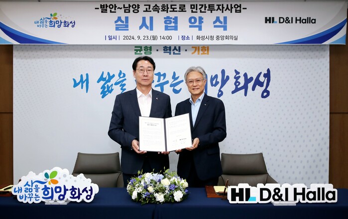 화성시(시장 정명근)는 23일 ‘발안남양도로주식회사를’를 사업시행자로 최종 지정하고 주간사인 HL디앤아이한라(주)와 ‘발안~남양 고속화도로 민간투자사업 실시협약’을 체결했다고 밝혔다.