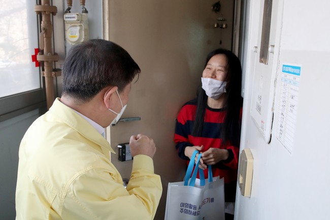 <사진/ 박승원 광명시장은 3월 31일 오후 철산동 아파트 2곳을 찾아 책을 배달했다>