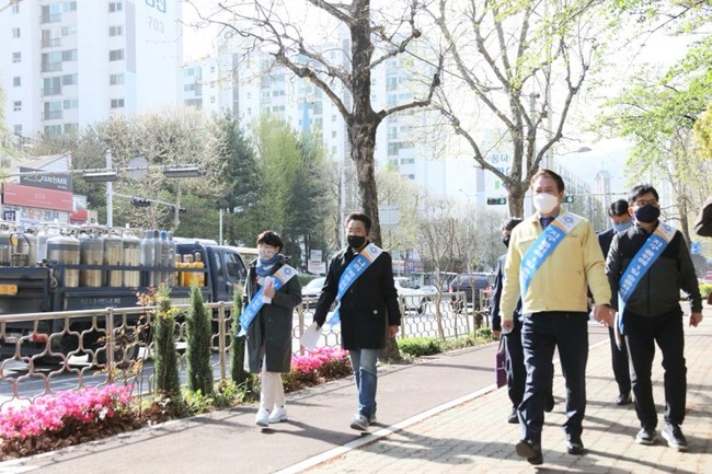 [안양=로컬라이프] 송준형 기자 = 4월 22일 제50주년 지구의 날을 맞아 최대호 안양시장이 도보로 출근하며 거리의 시민들과 소통의 시간을 가졌다.