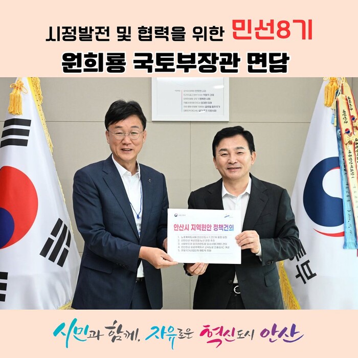 [로컬라이프] 송준형 기자 = 이민근 안산시장은 22일, 세종시에서 원희룡 국토부장관님을 뵙고 안산시 주요현안에 대해 면담을 다음과 같이 가졌다고 밝혔다.