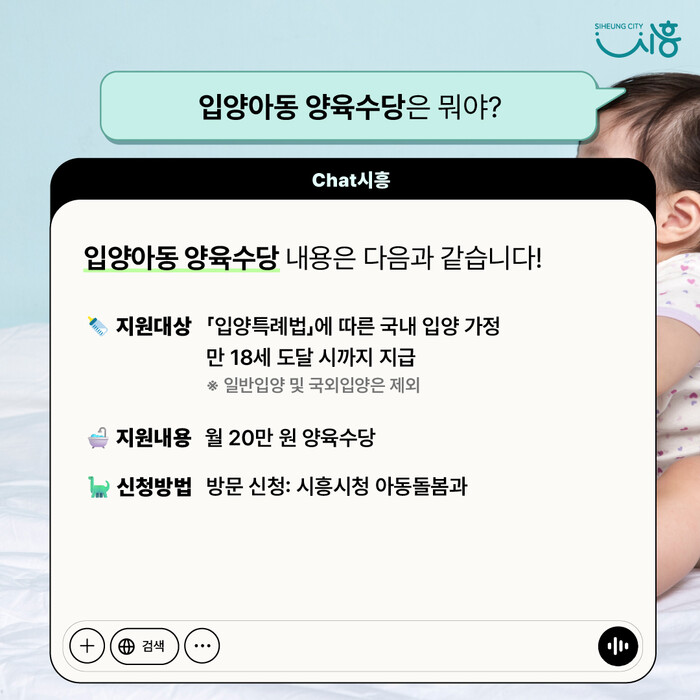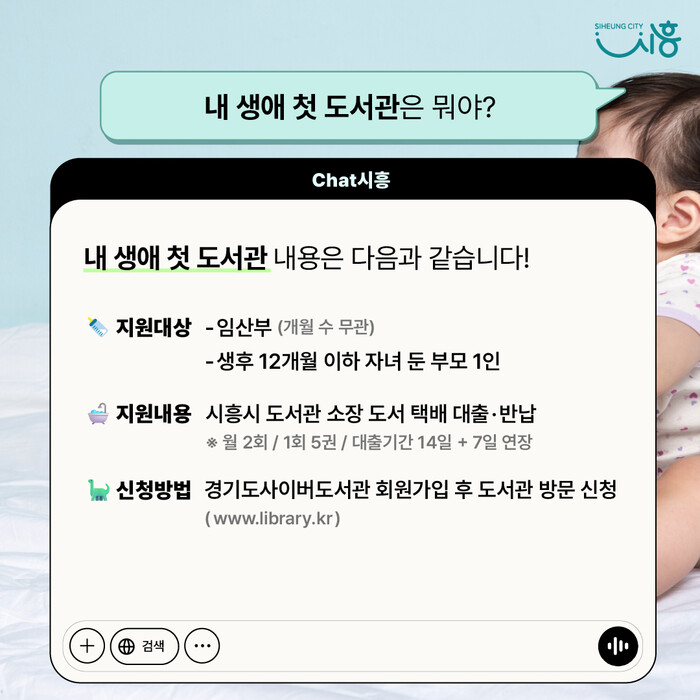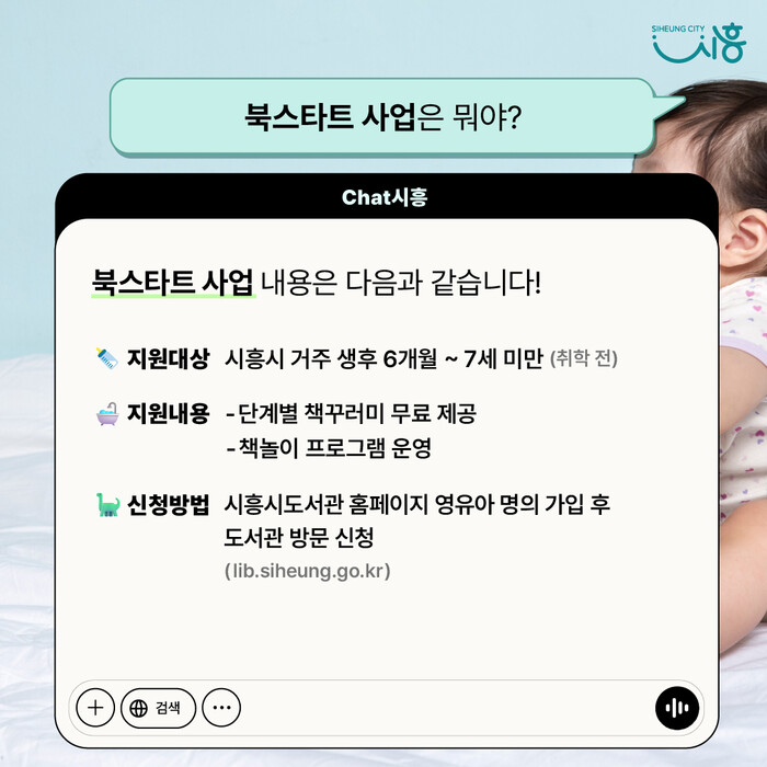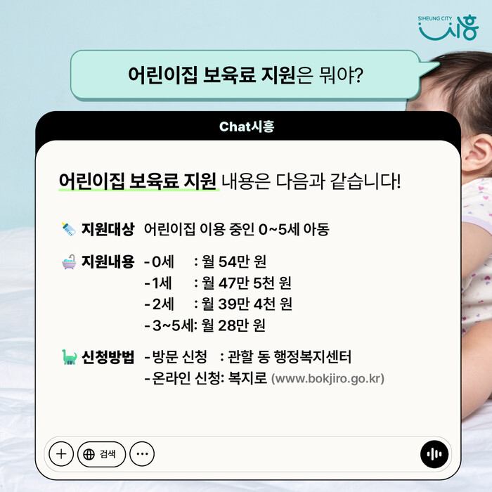 7일, 시흥시는 페이스북에 <시흥 Pick! 나를 위한 맞춤 정책=영유아 1편!>을 올려 “생활비 부담은 줄이고, 양육 환경은 더욱 촘촘하게! 아이의 건강한 성장과 부모의 안정적인 양육을 위한 다양한 영유아 맞춤형 정책을 지금 확인해보세요!”라고 알렸다.