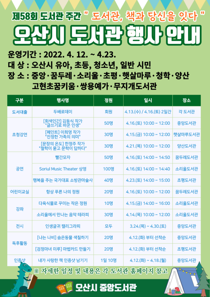 오산시(시장 곽상욱) 중앙도서관은 4월 제58회 도서관 주간을 맞이해 시민들의 독서 의욕을 고취하고, 도서관의 가치와 필요성을 널리 알리고자 ‘도서관, 책과 당신을 잇다’라는 주제로 다양한 프로그램을 진행한다.