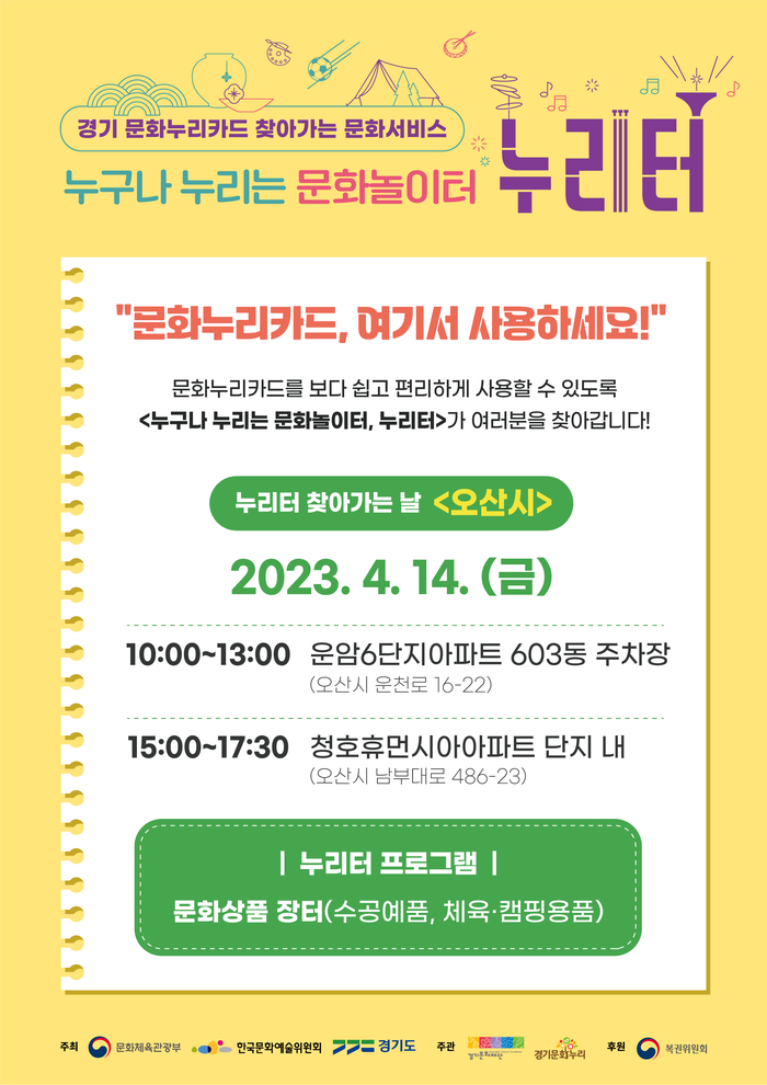 오산시(시장 이권재)는 오는 14일 찾아가는 문화서비스인 ‘누리터’를 대원동 지역(운암6단지, 청호동휴먼시아아파트 단지 내)에서 운영한다고 밝혔다.