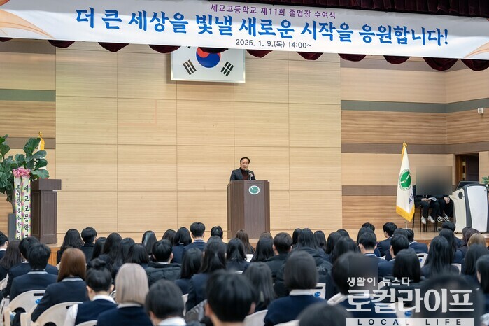 | ▲ 이권재 오산시장이 ‘세교고등학교 졸업식’에 참석해 축사를 하고 있다. (사진출처=이권재 페이스북) |