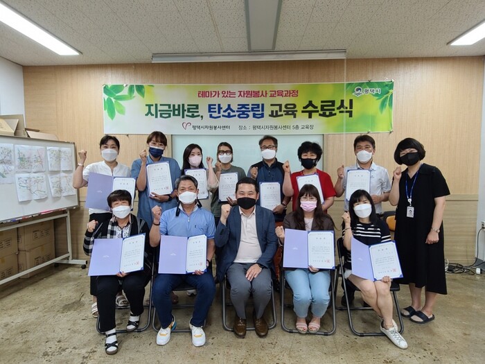 평택시자원봉사센터(센터장 방미옥)는 자원봉사자 24명을 대상으로 테마가 있는 자원봉사 교육 ‘지금 바로, 탄소중립’ 과정을 운영하고 지난 28일 수료식을 가졌다.
