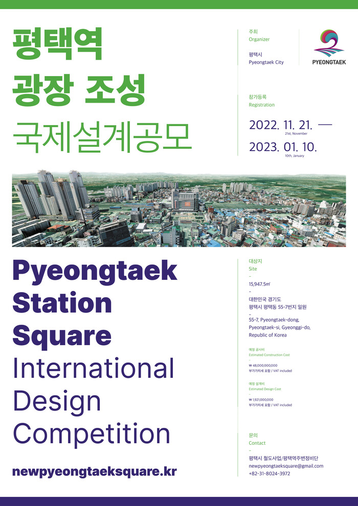 시 관계자는 “평택역 광장 조성은 원도심 변화의 첫걸음으로 이번 공모에 국내외 우수한 전문가의 많은 참여와 참신한 작품으로 새로운 평택역 광장이 지역을 대표하는 랜드마크로 거듭나길 기대한다”고 말했다.