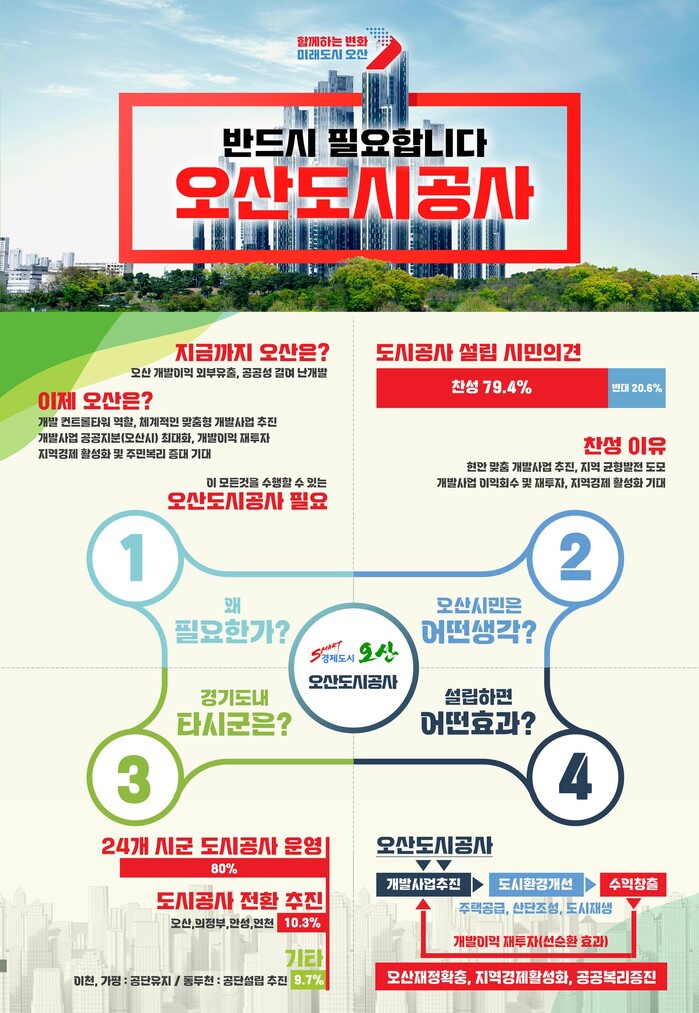 하지만 도시공사 설립을 위해서는 시설관리공단 폐지 조례안, 도시공사 설립 조례안, 시설관리공단 조직변경 동의안 등 여러 안건의 시의회 의결 과정이 남았다며, 내년 상반기에는 경제자족도시 오산 시대를 뒷받침할 오산도시공사 관련 안건들이 시의회를 통과할 수 있도록 최선을 다하겠다고 말했다.