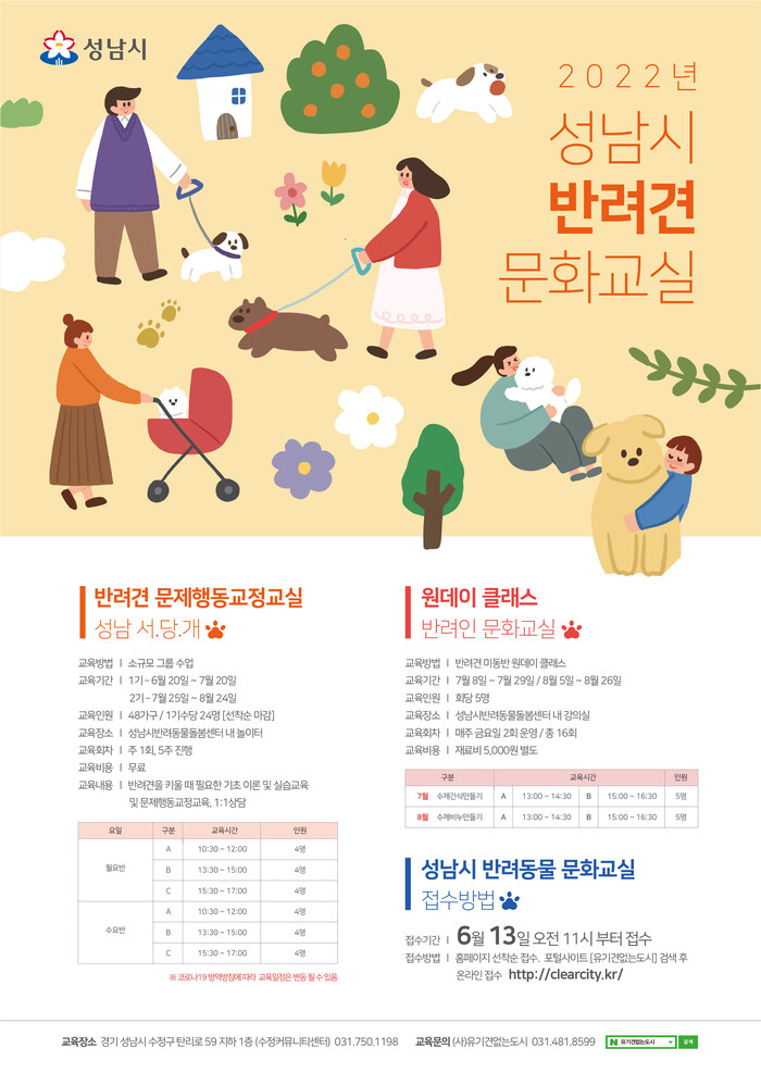 성남시는 오는 6월 20일부터 8월 26일까지 수진동 수정커뮤니티센터 지하 1층 반려동물 돌봄센터에서 ‘반려견 문화교실’을 운영한다.