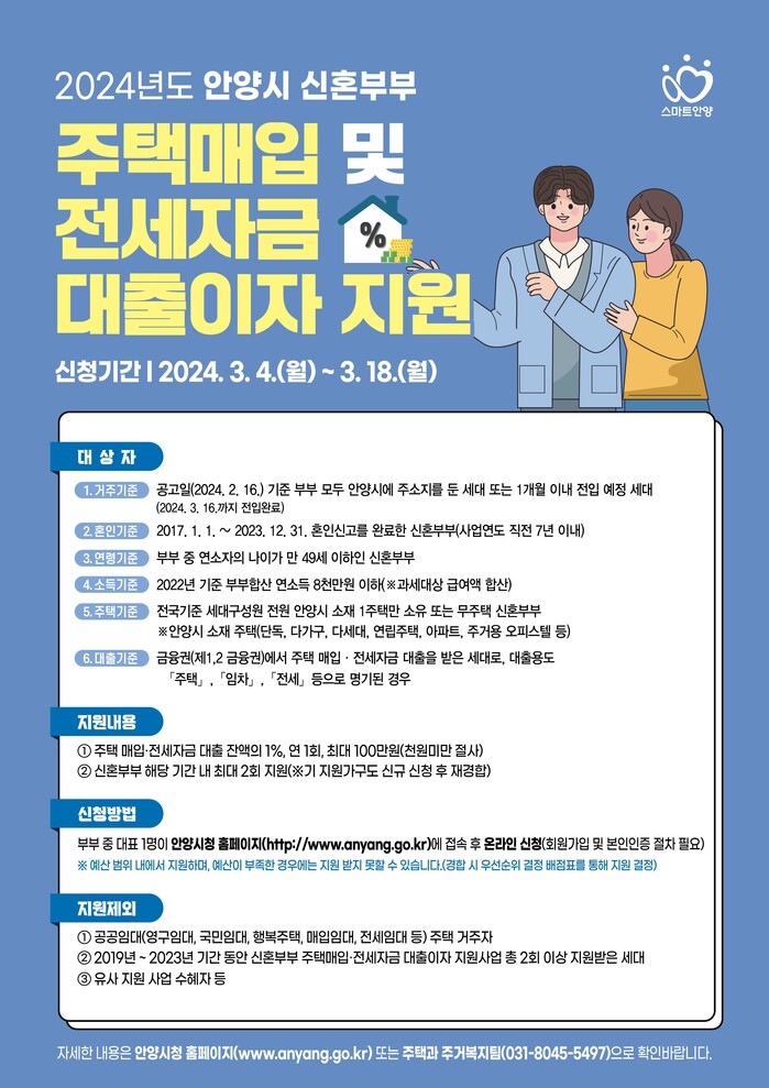 안양시는 관내 신혼부부의 주거비 경감을 위해 ‘신혼부부 주택매입 및 전세자금 대출이자 지원’ 사업 참여자를 모집한다고 16일 밝혔다.