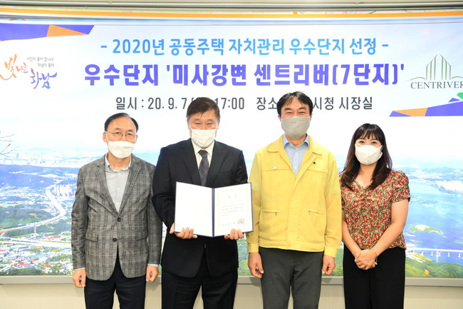 [로컬라이프] 하남시는 2020년 공동주택 자치관리 아파트 우수단지로‘미사강변 센트리버(미사7단지)’아파트를 선정, 지난 7일 오후 시장실에서 입주자대표회장 등 관계자 3명이 참석한 가운데 시상식을 가졌다고 밝혔다.