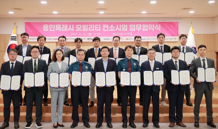 용인특례시(시장 이상일)는 18일 시청 비전홀에서 첨단 모빌리티 시범사업 추진을 위해 시를 비롯한 산·관·학‧연 18개 기관이 ‘모빌리티 컨소시엄’을 구성하고 업무 협약을 맺었다.