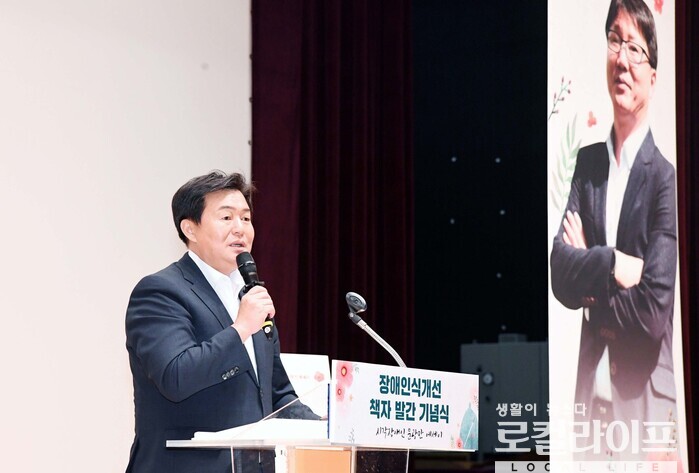 | ▲ 임병택 시흥시장이 문광만 시흥시 시각장애인협회장의 <장애인식개선 책자 발간> 기념식에 참석해 축사를 하고 있다. (사진출처=임병택 페이스북) |