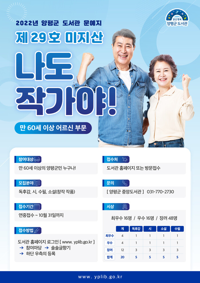 양평군(군수 전진선)이 군민의 순수문예 창작활동 작품집인 ‘미지산’발간에 따른 원고를 오는 10월 31일까지 모집한다고 밝혔다.