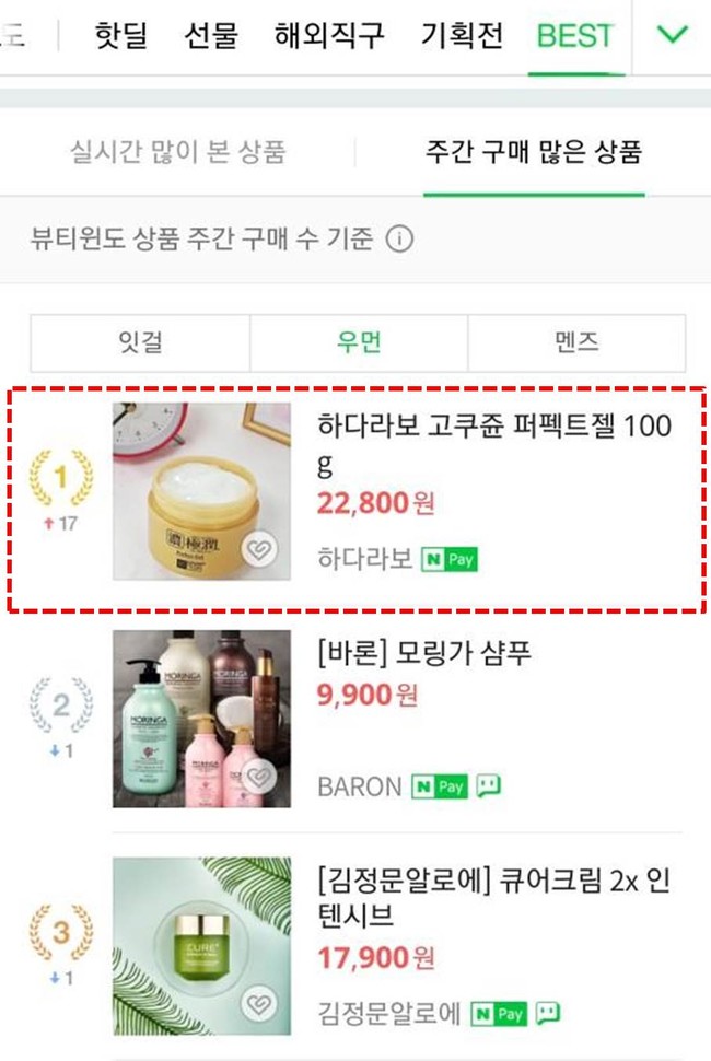 사진/ 하다라보 고쿠쥰 퍼펙트젤 네이버 쇼핑뷰티윈도 주간 판매 1위