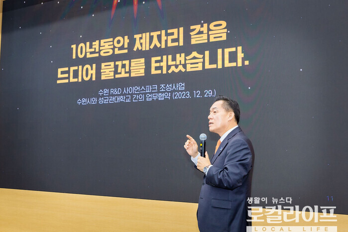 이어 “우리 시와 성균관대학교가 ‘R&D 사이언스파크 조성을 위한 상생협약’을 맺었다. 이어, 입북동·율천동 등 주민들께 협약 내용과 개발 청사진을 소개드렸다”며 “강산이 변하는 세월을 돌아 첫 단추를 끼운 만큼 앞으로의 사업은 보다 속도감 있게 진행될 것이다. 2025년까지 개발계획 수립과 실시계획 인가 등 절차를 마무리하고, 2026년 본격 착공을 목표로 빈틈없이 준비하겠다”고 밝혔다.