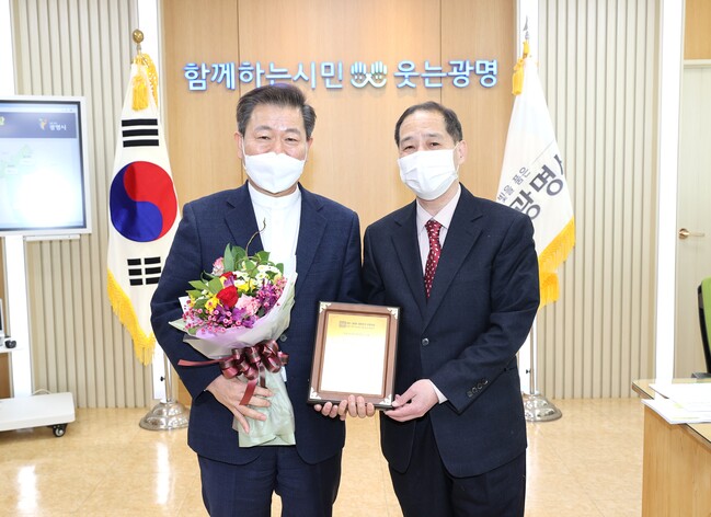 사진/광명시는 한국조명신문이 주최하고 대한민국 조명대상 운영위원회가 주관한 2021년 제5회 대한민국 조명대상에서 ‘지방자치단체부문 대상’을 받았다(왼쪽 박승원 광명시장, 오른쪽 한국조명신문 김중배 대표) (사진제공=광명시)