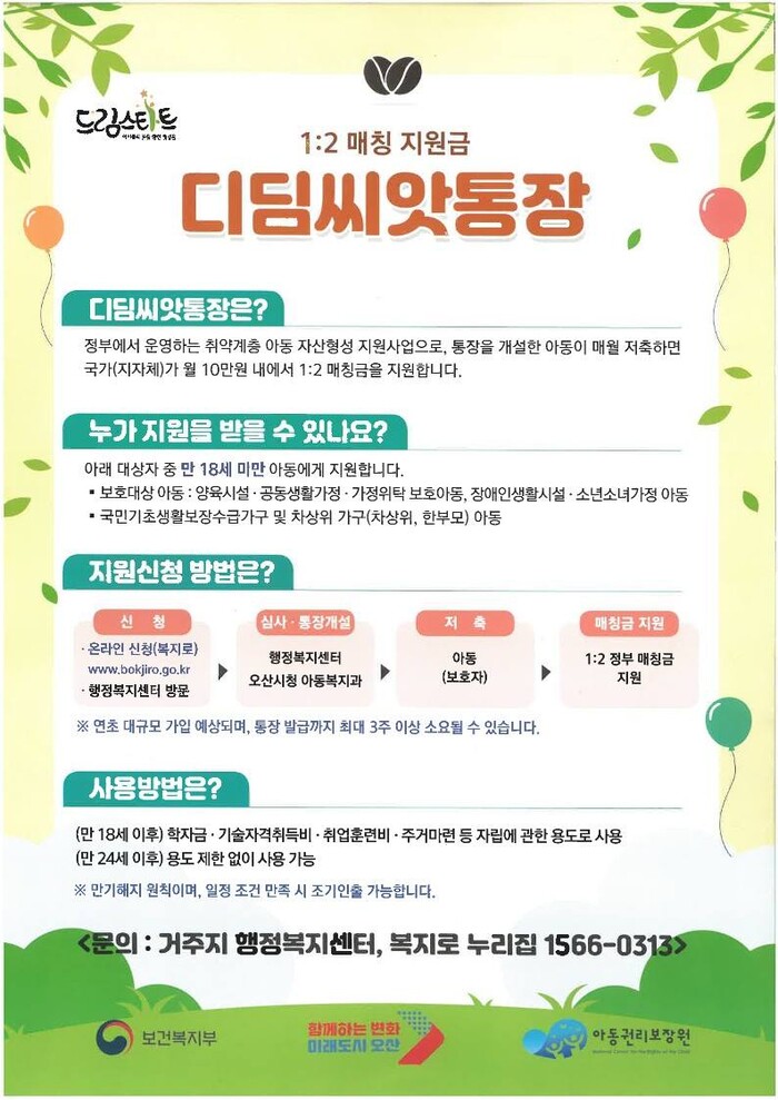 아울러 저 또한 후원자로서 디딤씨앗통장에 동참했다며, 작은 정성이지만 아이들의 미래를 함께 키워갈 수 있다는 생각에 큰 행복을 느낀다. 후원을 희망하는 단체나 개인은 오산시 아동복지과 또는 각 동 행정복지센터에 방문하거나 031-8036-8722로 문의하면 후원 연계를 받을 수 있다고 덧붙였다.