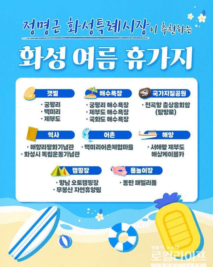 [화성=로컬라이프] 송준형 기자 = 정명근 화성특례시장이 화성지역 여름휴가 명소를 페이스북을 통해 소개했다.