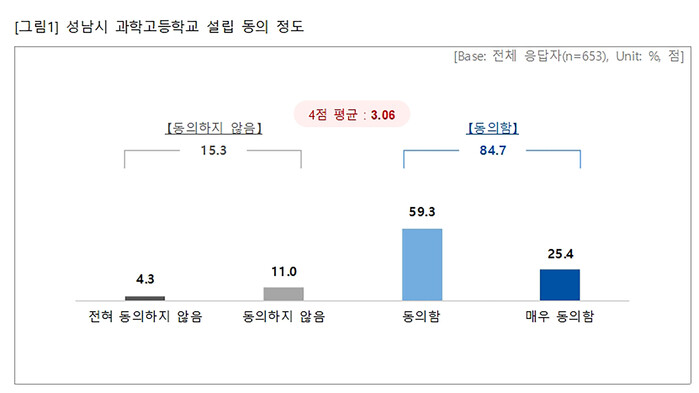 성남시는 시 산하 연구기관인 시정연구원이 지난 7월 15일부터 22일까지 과학고 설립 관련 온라인 설문 조사를 벌인 결과 응답한 시민 653명 중 84.7%(553명)가 동의한다고 답했다며 5일 이같이 밝혔다.