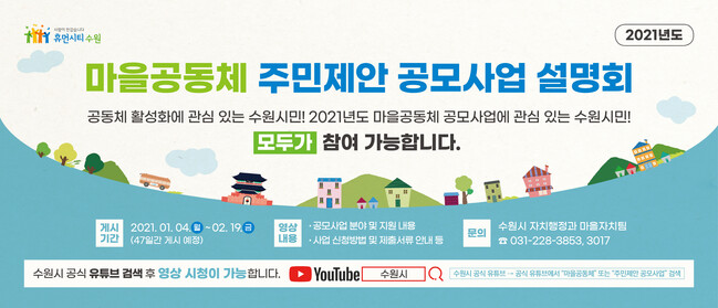수원시는 온라인 사업설명회 영상을 제작해 4일부터 수원시 공식 유튜브 채널(검색창에서 ‘수원시’ 검색)에 게시했다. 마을공동체 공모사업 개요, 추진 일정, 신청 방법 등을 소개한다.