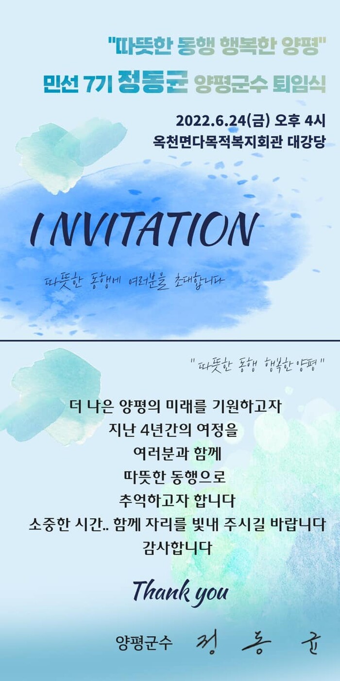 [로컬라이프] 송준형 기자 = 정동균 양평군수는 22일, 자신의 페이스북을 통해 그동안 민선7기, 군민 여러분들께서 보내주신 아낌없는 성원과 사랑에 감사드리며, 지난 4년간의 여정을 군민 여러분과 함께 추억하며 제 소임을 마무리하고자 한다고 밝혔다.