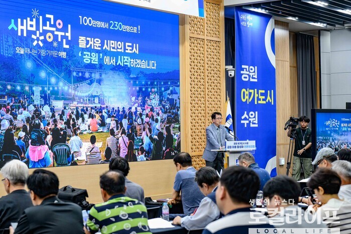 최재군 수원시 공원녹지사업소장은 6일 시청 중회의실에서 '수원시 공원 이용 활성화 언론 브리핑'을 열고, "공원녹지 정책 대전환으로 새로운 패러다임의 '공원 여가 도시 수원'을 구현하겠다"며 공원 이용 활성화를 위한 3대 전략과 10대 사업을 발표했다.