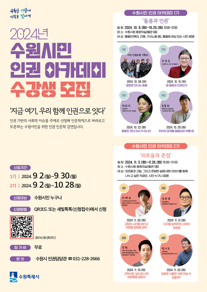 ‘지금 여기, 우리 함께 인권으로 잇다’를 주제로 하는 수원시민 인권 아카데미는 1기 ‘돌봄과 인권’(10월 8~29일 매주 화요일 오전 10시~정오), 2기 ‘외로움과 존엄’(11월 5~26일, 매주 화요일 오후 7~9시) 과정으로 이뤄진다. 교육은 각각 4회에 걸쳐 수원시청 중회의실에서 열린다.