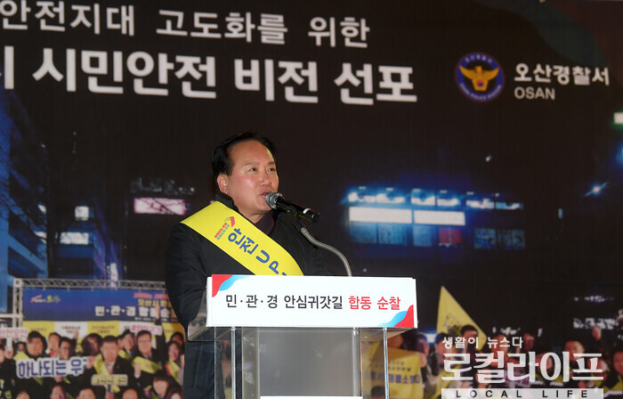이권재 시장은 “어제(29일) 날씨가 무척 추운 가운데에도 경찰, 시민단체분들과 함께 원동사거리에서 오산역광장까지 구석구석 살피는 안심귀가길 합동순찰 후 오산시 안전비전 선포식을 열었다”며 “꾸준한 인구증가에 따라 오산을 더 안전한 환경으로 업그레이드 하는데 함께 공동노력 하자는 다짐의 자리였다”고 밝혔다.