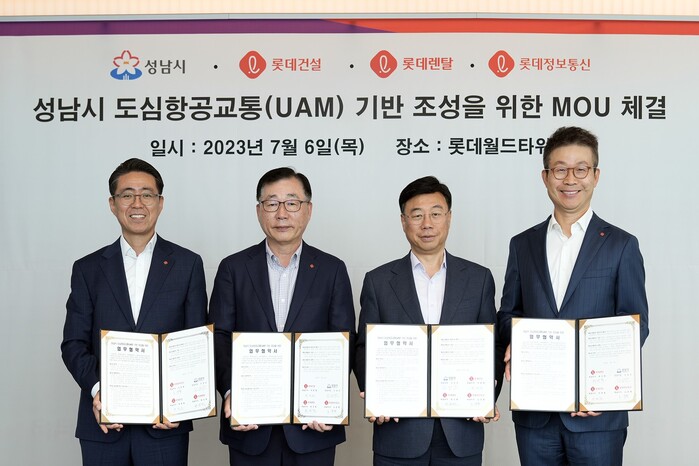 성남시(시장 신상진)는 7월 6일 롯데월드타워에서 롯데건설, 롯데렌탈, 롯데정보통신(롯데 컨소시엄)과 ‘성남시 도심항공교통(UAM) 기반 조성을 위한 업무협약’을 체결하여 도심항공교통 상용화를 위한 첫걸음을 내디뎠다.