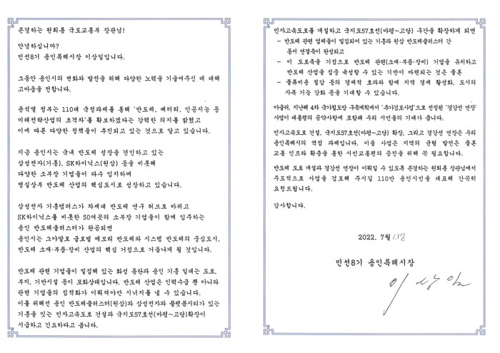 이 시장은 서한문에서 “반도체 산업은 인력수급뿐 아니라 관련 기업들의 집적화가 이뤄져야 시너지를 낼 수 있다. 이를 위해선 용인 반도체클러스터(원삼)와 삼성전자와 플랫폼시티가 있는 기흥을 잇는 민자고속도로 건설과 국지도 57호선(마평~고당) 확장이 시급하고 긴요하다”고 밝혔다.