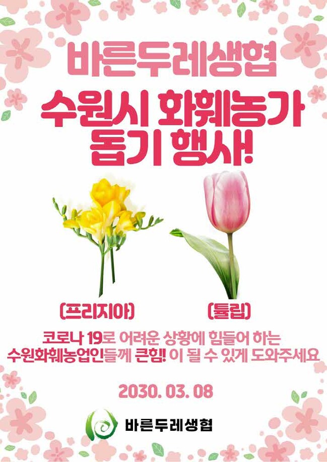 첫 행사는 8일 바른두레소비자생활협동조합 7개 매장 현장 판매와 전화 주문으로 진행됐다. 바른두레소비자생활협동조합 영통점·매탄점·천천점(관내), 동탄점·안양점·평촌점·인덕원점(관외) 매장 등에서 열린 판촉 행사에서는 수원시 내 화훼농가에서 생산한 프리지어, 튤립 등의 꽃이 판매됐다.