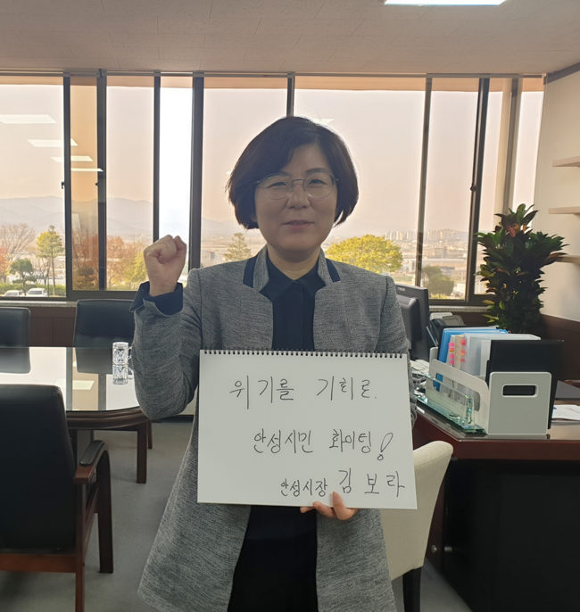 23일, 안성시에 따르면 김 시장은 코로나19 여파로 어려움을 겪고 있는 주민들에게 희망의 메시지를 전달하기 위해, 본인의 SNS에 ‘위기는 기회, 안성시민 파이팅’이라는 손글씨 문구를 들고 찍은 사진을 게재했다.