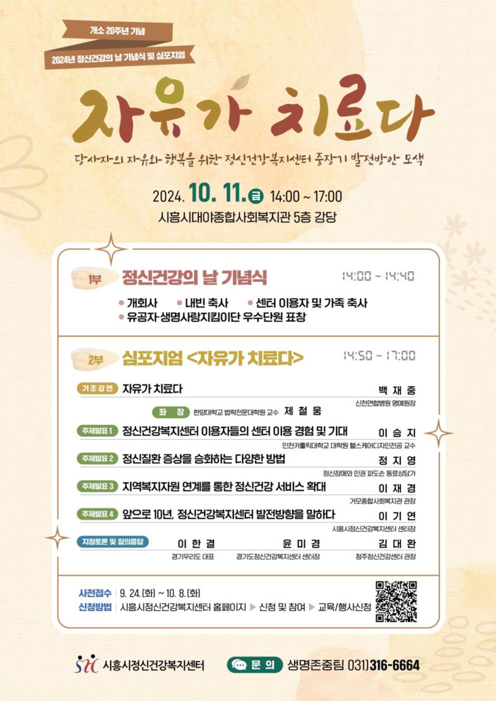 시흥시정신건강복지센터는 개소 20주년을 맞아 오는 10월 11일 시흥시대야종합사회복지관 5층 강당에서 ‘2024년 정신건강의 날 기념식 및 심포지엄’을 개최한다.