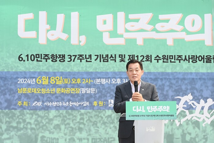 특히 ‘살인탄’이 된 최루탄과 무자비한 진압봉에도 굴하지 않았다. 전투경찰 방패에 꽃을 달고 가슴엔 꽃다발을 안기며 평화 시위를 이어갔다. 민주주의를 향한 수원시민의 열망은 그토록 간절했고, 의연했고, 아름다웠다. 그리고 마침내 국민이 주권자임을 확인하는 위대한 승리의 역사가 됐다고 강조했다.