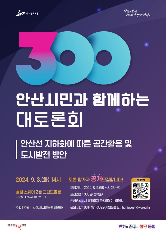 이번 대토론회는 안산시민 누구나 참여 가능하며, 300명 선착순 신청을 받는다. 참가 신청은 오는 23일까지 홍보자료의 QR코드를 이용, 안산시 누리집(홈페이지) ‘동행이야기’에 접속하거나 새소식의 신청서를 내려받아 작성 후 이메일(hanjuyoen@korea.kr)로 제출하면 된다. 자세한 사항은 안산시청 시민협력관(031-481-3092)으로 문의하면 된다.