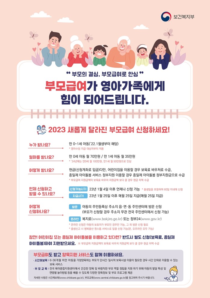 부모급여 지원 대상은 2022년 1월 1일 이후 출생한 영아로 소득과 재산에 상관없이 만 0세(0~11개월) 아동의 부모는 월 70만원, 만 1세(12~23개월) 아동의 부모는 월 35만원을 매달 25일에 신청한 계좌로 지급받을 수 있다.