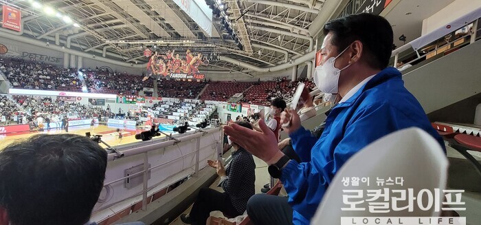 [안양=로컬라이프] 송준형 기자 = 최대호 안양시장 예비후보(더불어민주당)는 지난 25일, 안양체육관에서 열린 KBL프로농구 4강 플레이오프 3차전 ‘안양 KGC vs 수원 KT’의 경기를 관람했다.