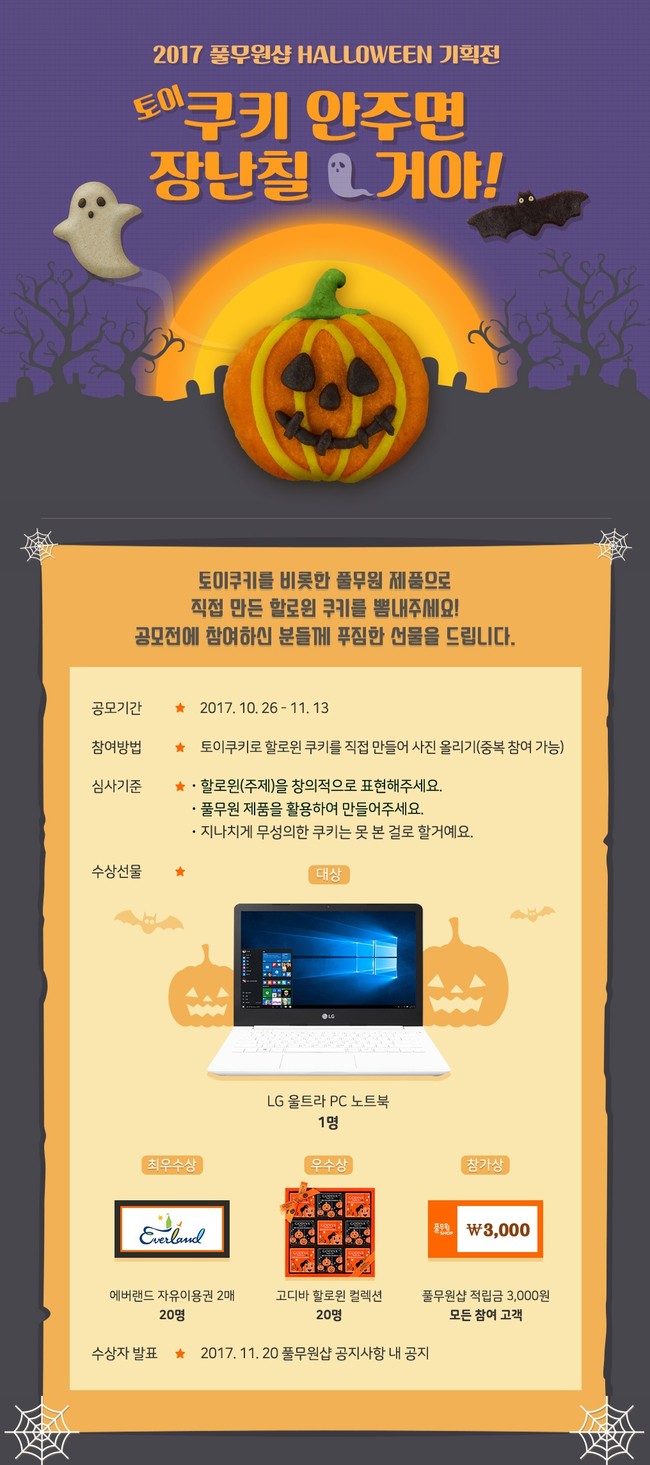 전체 응모자 중 할로윈을 창의적으로 표현한 참가자 41명을 선발, ▲대상(1명)은 LG 울트라 PC노트북 1대 ▲최우수상(20명)은 에버랜드 자유이용권 2매 ▲우수상(20명) 고디바 할로윈 컬렉션(초콜릿 세트)을 증정한다. 모든 참여자에게는 ‘풀무원샵’ 적립금 3천원을 지급한다.