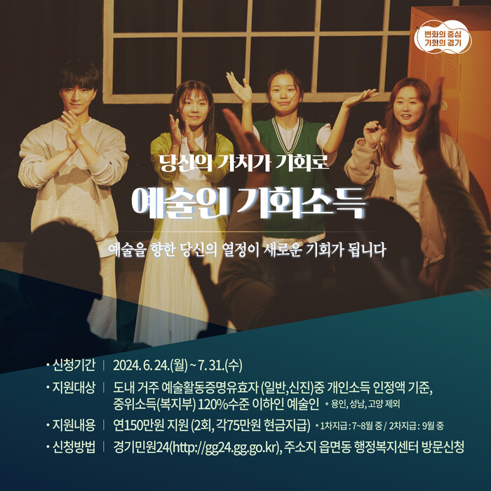 안성시가 6월 24일(월) 오전 9시부터 7월 31일(수) 오후 6시까지 경기도 예술인 기회소득 신청서를 접수받는다.