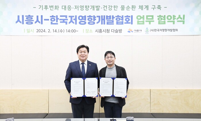 시흥시(시장 임병택)는 14일 시청 다슬방에서 환경부 소관 비영리법인인 ‘한국저영향개발협회’와 지속 가능한 물순환 체계 구축을 위한 업무협약을 체결했다.