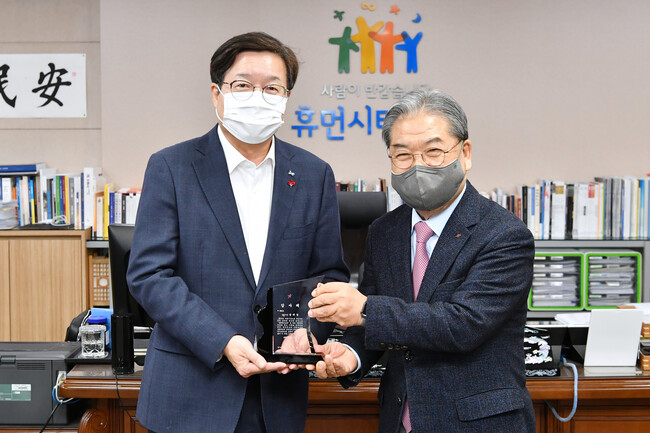 이재정 경기도 교육감은 27일 염태영 시장 집무실을 방문해 ‘2021년 경기도 교육 발전 기초지자체 협력사업 유공 기관장 표창’을 전달했다.