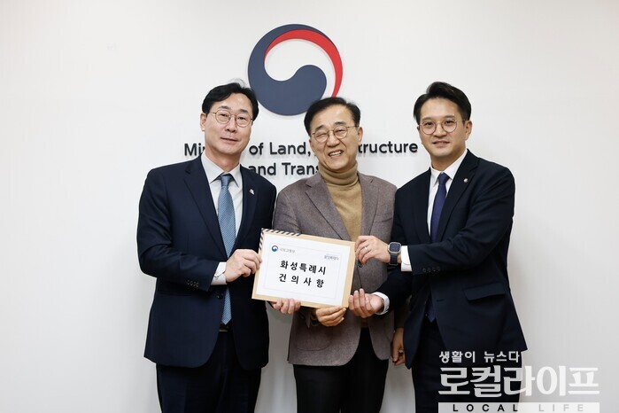 | ▲ 정명근 화성특례시장(왼쪽)와 전용기 국회의원(오른쪽)이 김윤덕 국토교통부 장관(가운데)에게 지역 주요 현안 건의사항을 전달하고 있다. (사진출처=정명근 페이스북) |