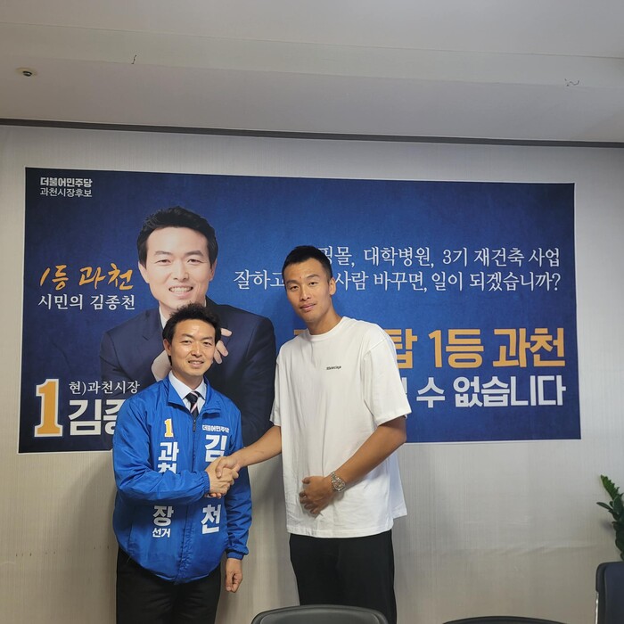[로컬라이프] 송준형 기자 = 김종천 과천시장 후보(더불어민주당)는 24일, 국가대표 축구선수 김신욱 선수가 응원차 저희 캠프에 방문했다고 말했다.