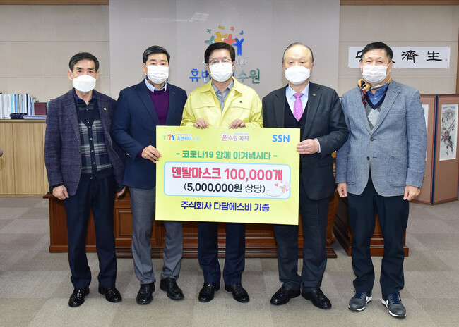 (주)다담에스비·(주)글라스원은 유용근 전 의원의 제안으로 수원시에 마스크를 기부하게 됐다. 유용근 전 의원은 10·11대(당시 지역구 ‘수원시·화성군’) 의원을 지냈다.